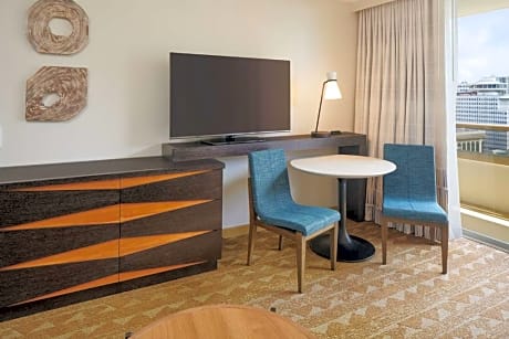 Each suite at Embassy Suites by Hilton Waikiki Beach Walk is designed for comfort, featuring a living room area, kitchenette with a refrigerator, microwave, and coffee machine. Select suites offer stunning city or ocean views from private balconies, providing an ideal setting for a relaxing stay.