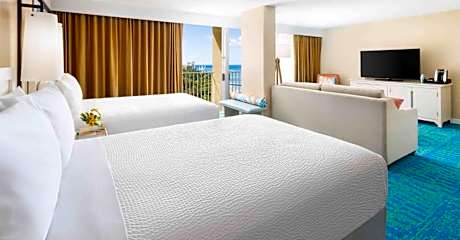 Each air-conditioned room includes a flat-screen cable TV and a compact refrigerator, ensuring a comfortable and convenient stay. Guests can savor island-inspired cuisine at the open-air Tiki's Bar and Grill, which features dishes such as coconut shrimp, calamari katsu, and kalua pig quesadillas.