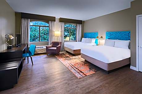 The modern rooms at Hotel Indigo San Antonio Riverwalk feature 42-inch flat-screen cable TVs, hardwood floors, free Wi-Fi, and CD players. Each room is equipped with a refrigerator and seating area, ensuring a comfortable and convenient stay. Guests can also choose rooms with scenic river views for an enhanced experience.