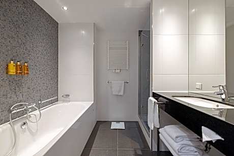 Each room at Crowne Plaza Amsterdam - South features a spacious seating area, a flat-screen TV with satellite and pay TV channels, and a large bathroom equipped with free toiletries, bathrobes, and slippers. Guests can enjoy a personalized sleep experience with the hotel's Pillow menu, offering five different pillow options.